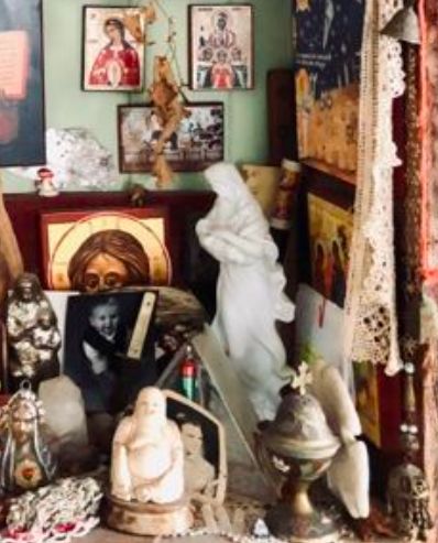 There’s a Mary in the corner, a gift from my husband. Behind her is a flute with Krishna on it and my athame, a righteously sharp kitchen knife in a soft leather cover I made many years ago. There is a delicate Mary made from glass from my sister, Kate Murray. An incense burner (far right on bottom) that opens on top, that can be carried around to bless a space, a gift from my son—Saraswati, Shiva (hard to see, in front of the wooden breast), and the Cursed Buddha.